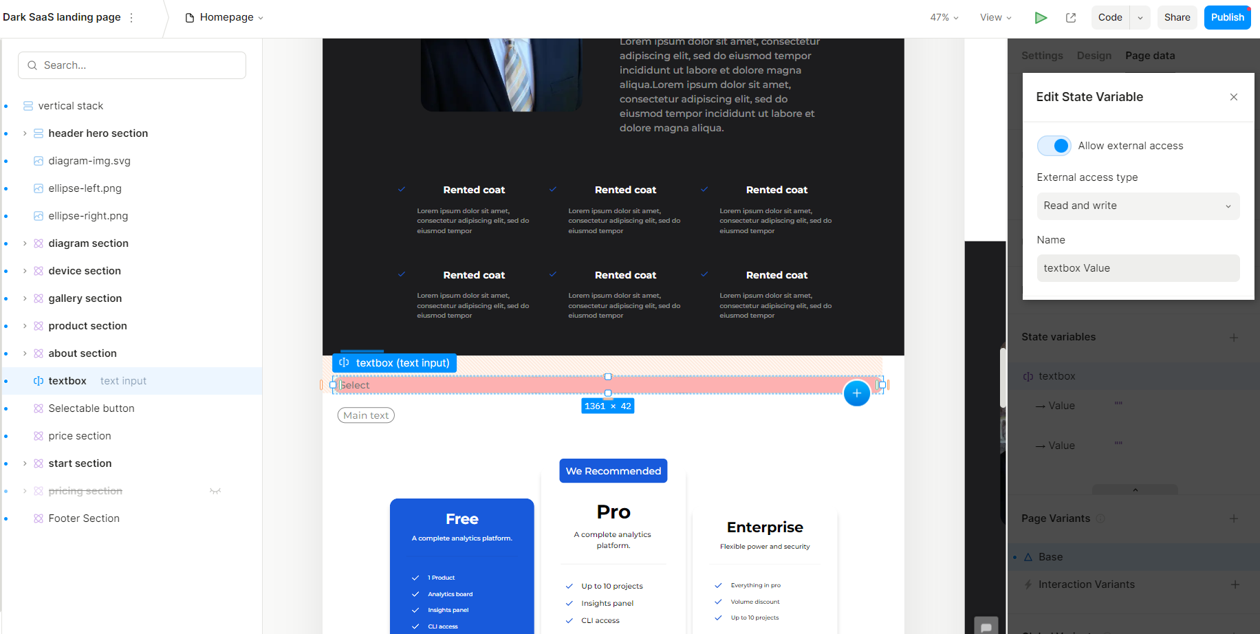 Hey, i was trying to make a text input bar that takes the text value from a component, have already read the docs about the state variables so just trying it out, but even after toggling the external access i cant find the state variable through the components page. can anyone tell what am i doing wrong ?