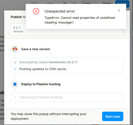 seems like it only happens to this specific project (64UNSJsM6LbtFDyqRHDDoZ). After I duplicated it the publishing worked ![]()