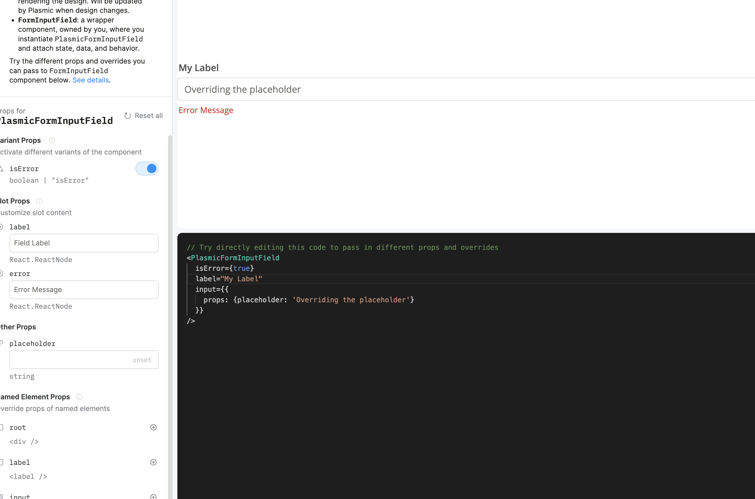 Hello Dusty! For named elements, we don’t expose the prop in the skeleton component (the component you can change, for example: PlasmicButton generates the skeleton component Button). So to fix this, all you need to do is go to the skeleton component of the InputFormField and expose a new prop there named input and pass it as a prop to the PlasmicInputFormField. Hope that helps!