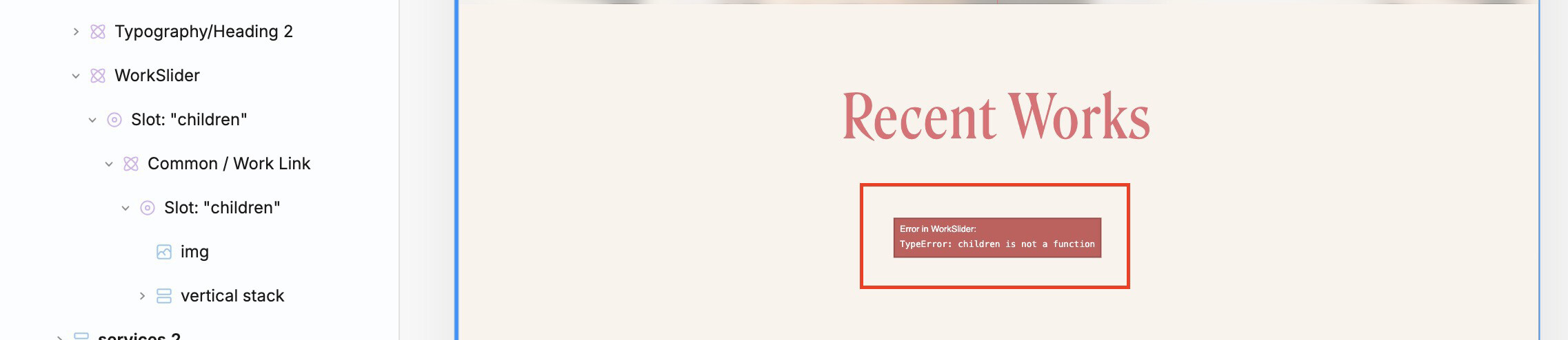 After loading my Work Slider component inside Plasmic, and adding my Work Link Card into the slider slot, I get the following error: