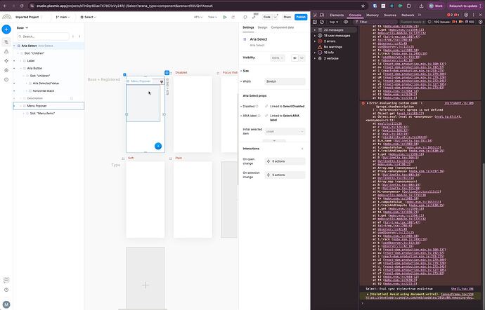 In my Plasmic Studio project, I’ve got a component with several select instances. Selecting “Preview the current artboard” and clicking the select crashes the project with these errors: