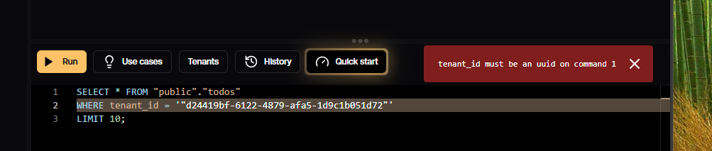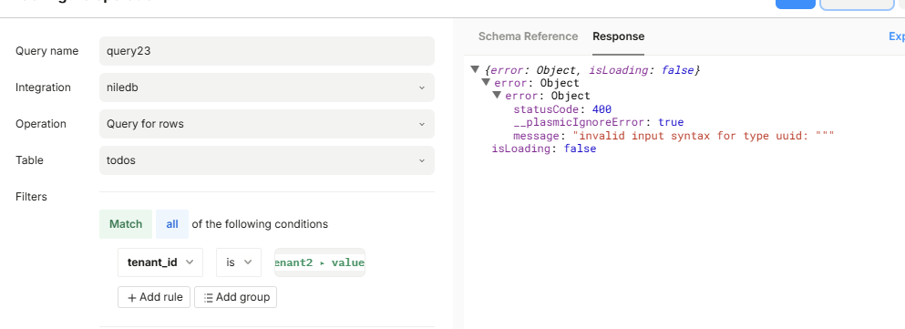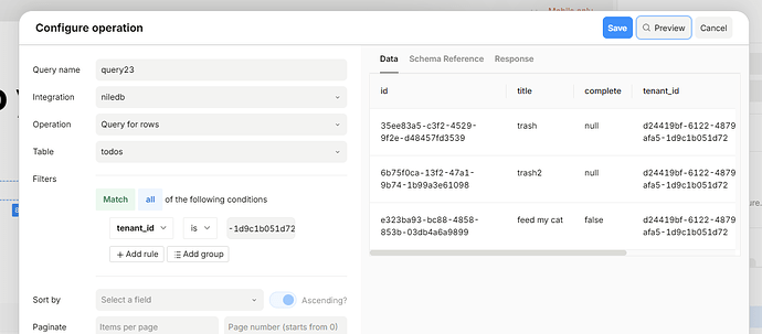 I’m investigating using NileDB with my Plasmic App. Part of this process I’m providing a tenant_id as a query filter. My thought was to put this into an input field so that I can provide it as a dynamic field to the query.