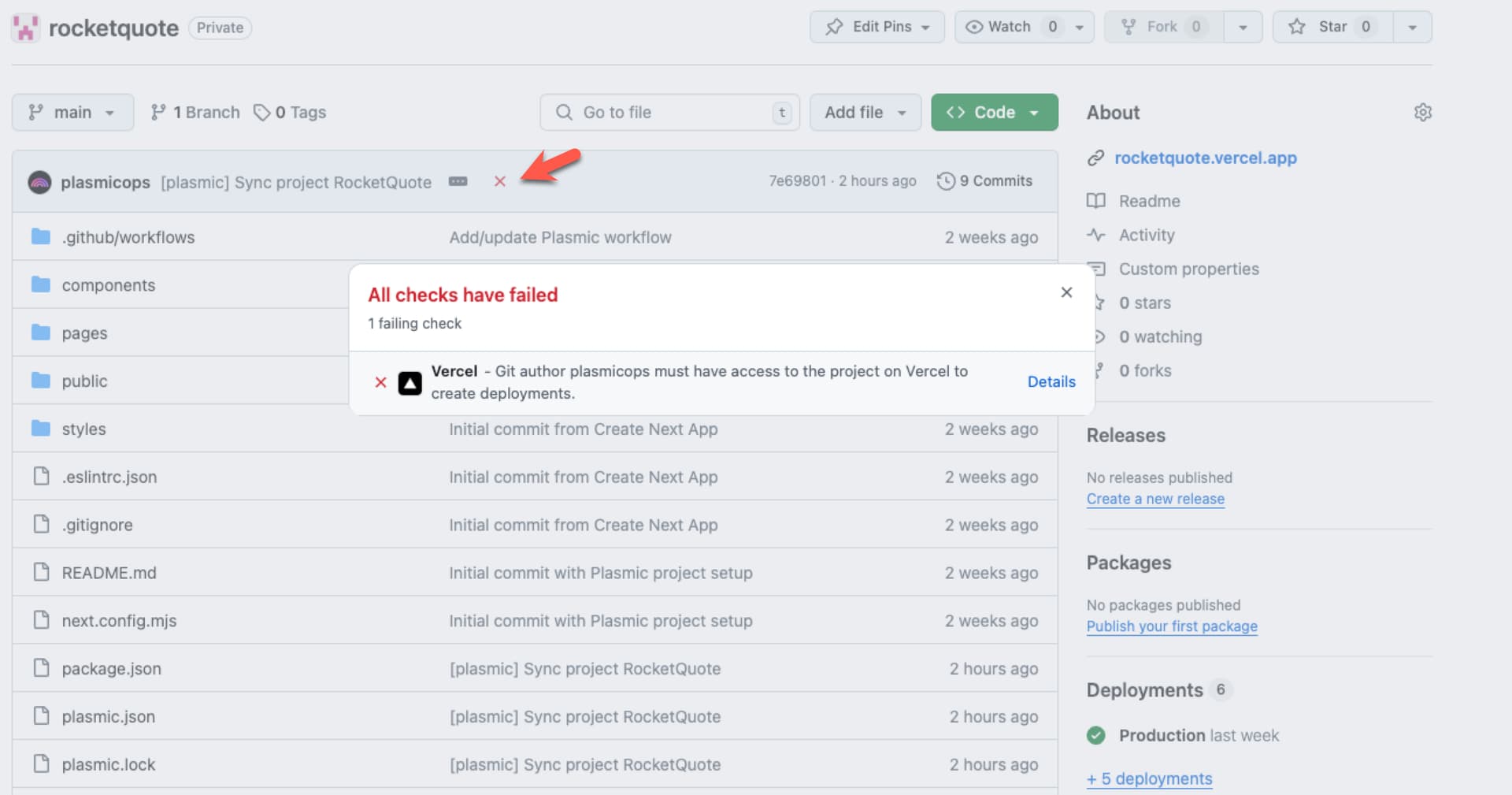 The Error message I get in Vercel is: The deployment XXXXXX with SHA XXXXXXXX is blocked due to insufficient permissions. The github user plasmicops is not part of the team.