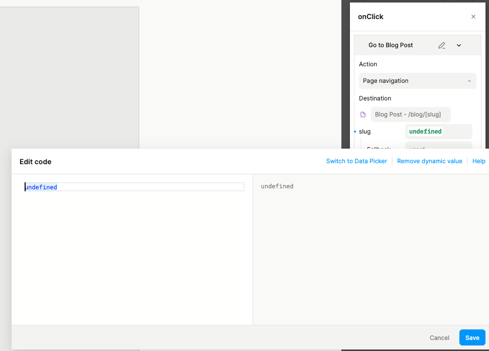 I am trying to ue CMS a pass a slug a “Post Card” but when I try to do it to use dynamic value with Page Navigation is always undefined. Do you have some idea about how to solve it? This is core to navigate between page with page aprams.