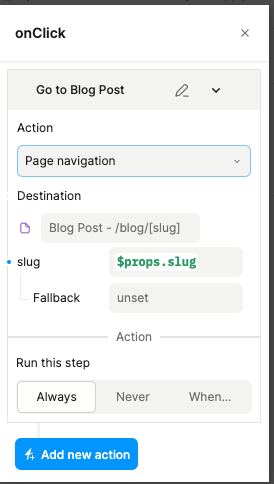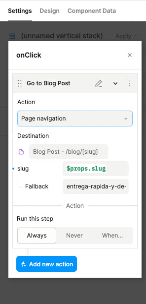 It is a Interaction of a Vertical Stack who is using a “Post Card” slug props. I did it mnaully, I mean, I writting the expression $props.slug and works sometimes (still debugging why click event did not trigger to go to other page sometime).