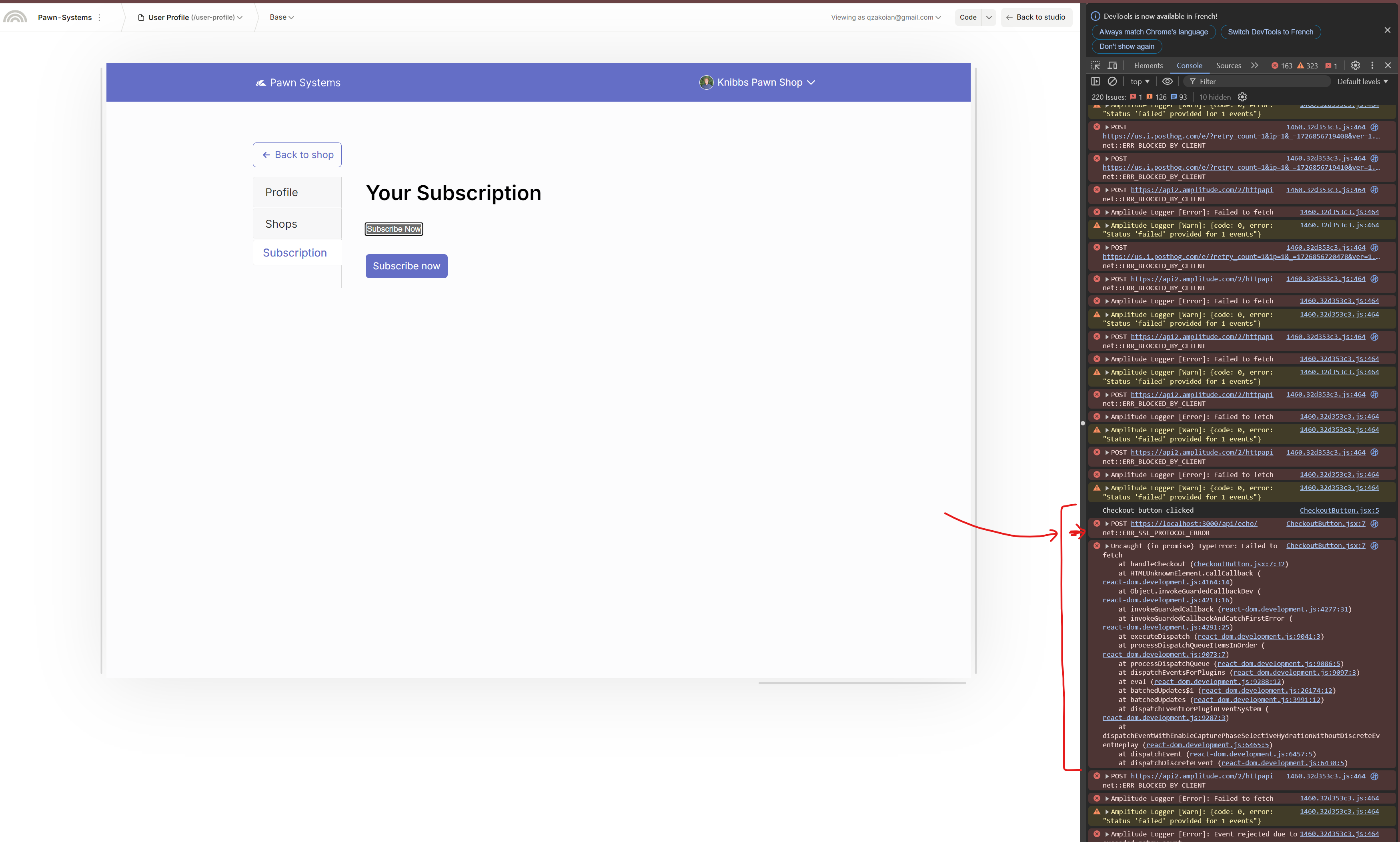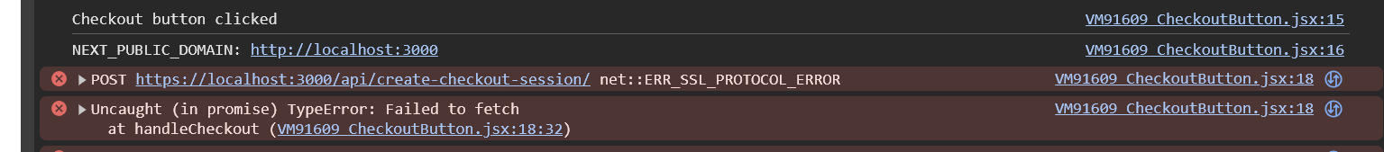 And here is the error I get when I click the Custom CheckoutButton in the preview mode in Plasmic (the grey button):